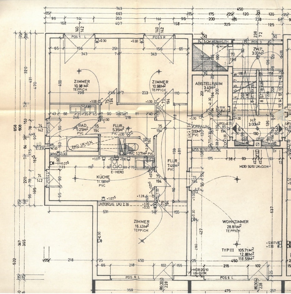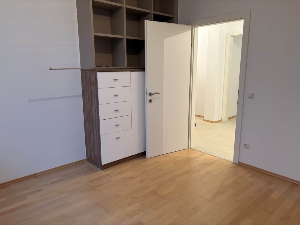 Die Wohnung besteht aus dem Vorraum mit Zugang zum Abstellraum, von dort geht es über den Flur zu den beiden Schlafzimmer, dem Badezimmer, dem WC.