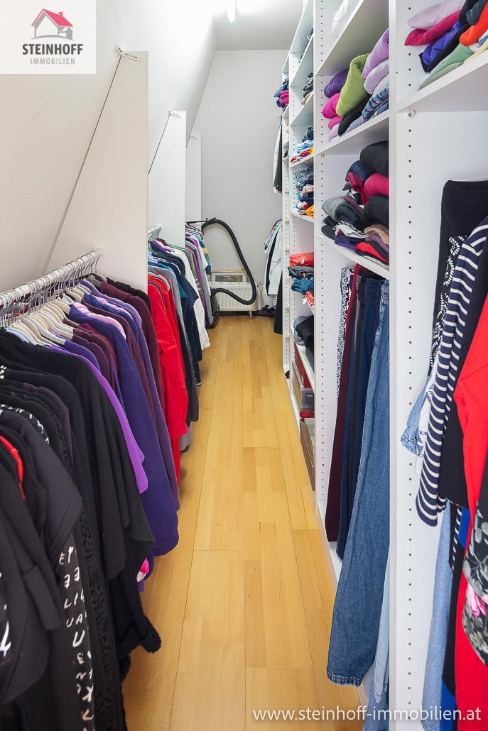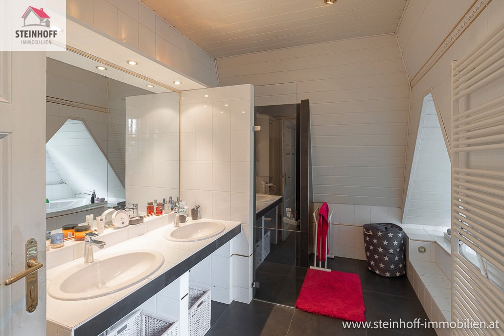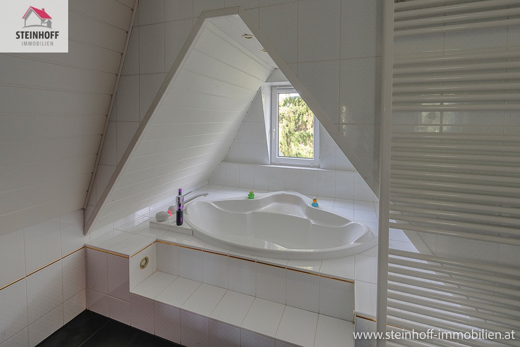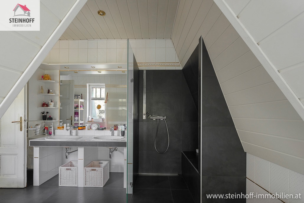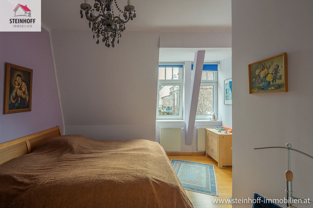 Über eine charmante Altbaustiege gelangt man ins Obergeschoß, hier befindet sich das große Bad mit Eckbadewanne und Dusche, das WC sowie 2 Schlafzimmer, eines mit großem Schrankraum.