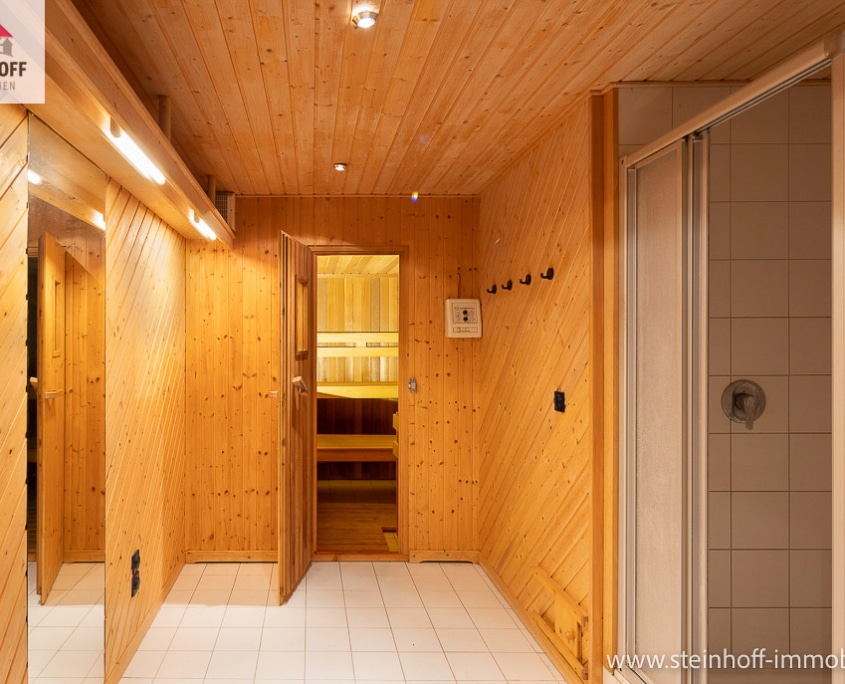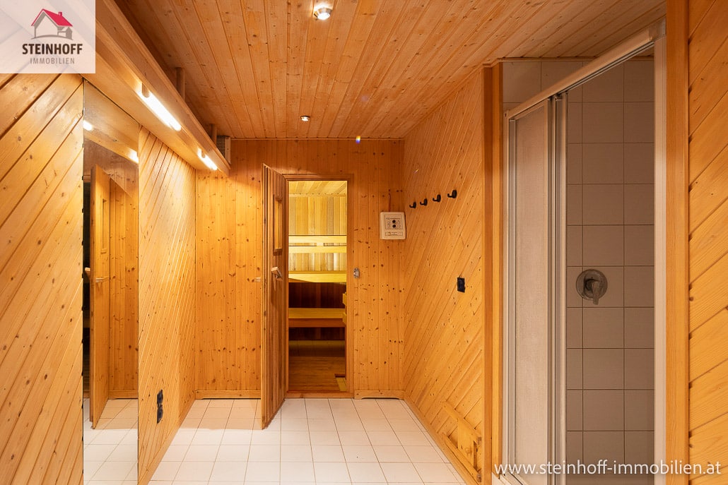 Im Keller befindet sich ein Wellnessbereich und ein Weinkeller.