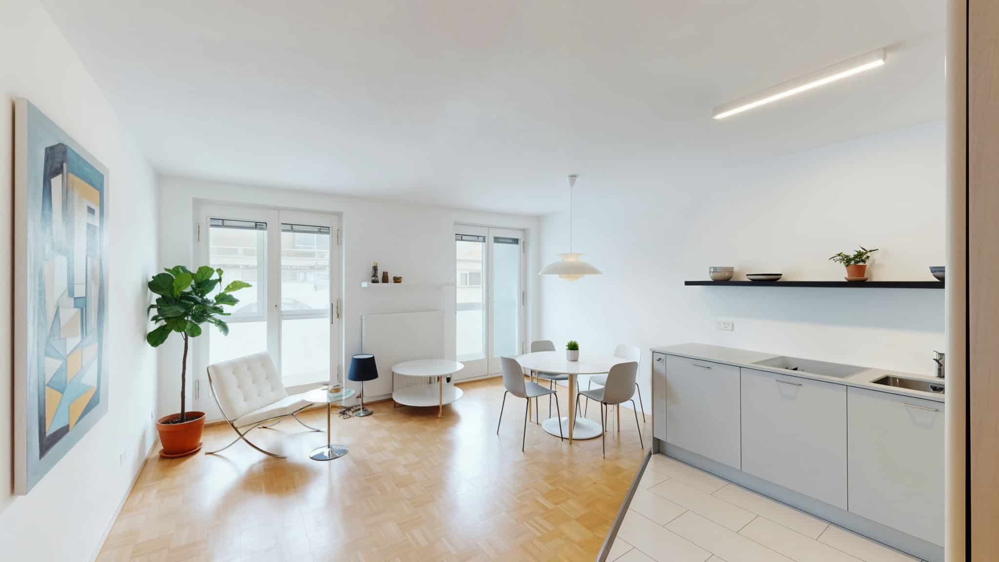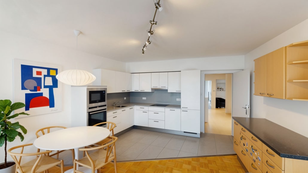 Auf der anderen Seite befindet sich die Wohnküche mit Ausgang auf die verglaste Loggia sowie noch ein Zimmer.